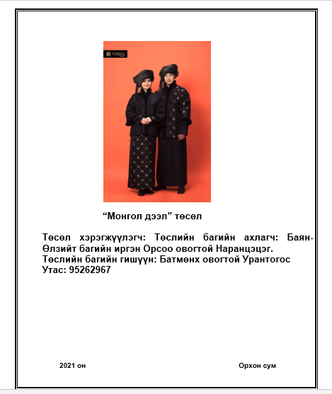 1. Оёдлын үйлдвэрлэлийн ажиллагааг жигдрүүлж Дархан-Уул аймаг, Орхон сумын иргэдийн хэрэгцээнд ур хийц сайтай монгол болон хүннү загварын дээл нийлүүлэх